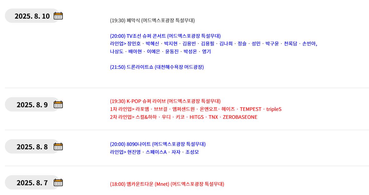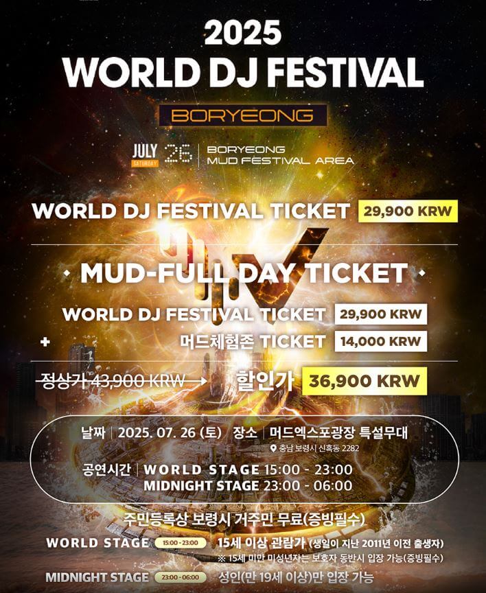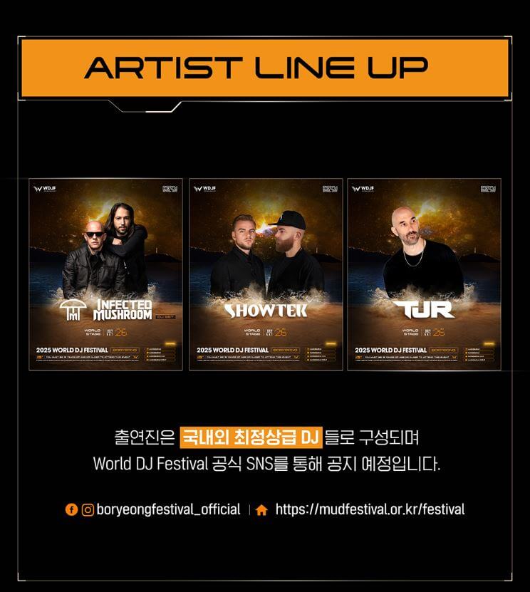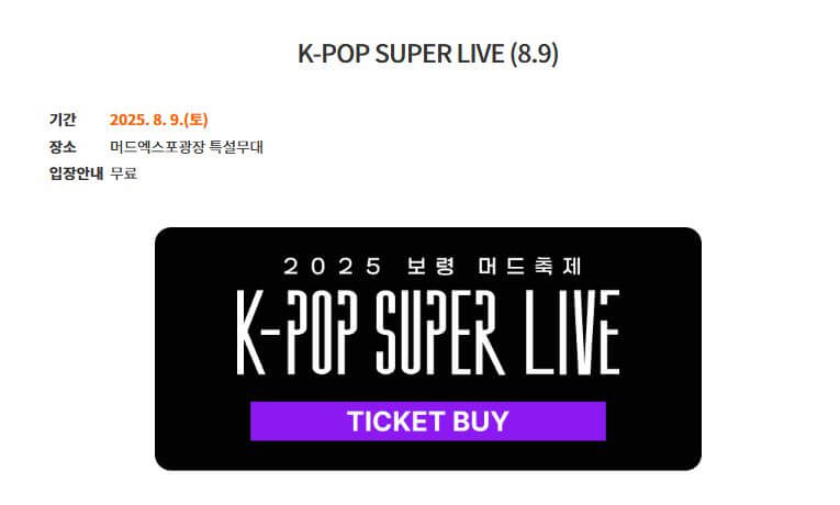 다양한 머드 체험존과 글로벌 퍼레이드, K-POP 콘서트까지 포함되어 있어 전 세대가 즐길 수 있는 대규모 여름 축제입니다.