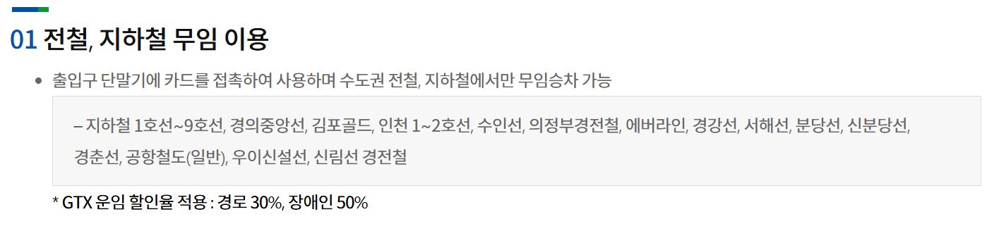 - 지하철/전철/공항철도 무료 이용: 수도권 지하철, 전철, 공항철도를 무료로 탑승할 수 있습니다.