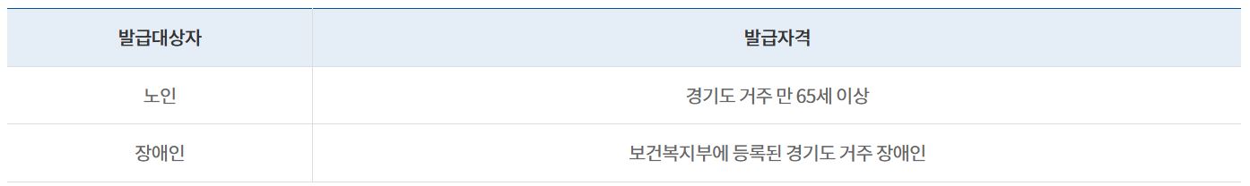 - 발급 대상: 주민등록상 주소지가 경기도인 만 65세 이상 노인 및 보건복지부에 등록된 경기도 거주 장애인. (상이 국가유공자는 보훈지청에서 발급)