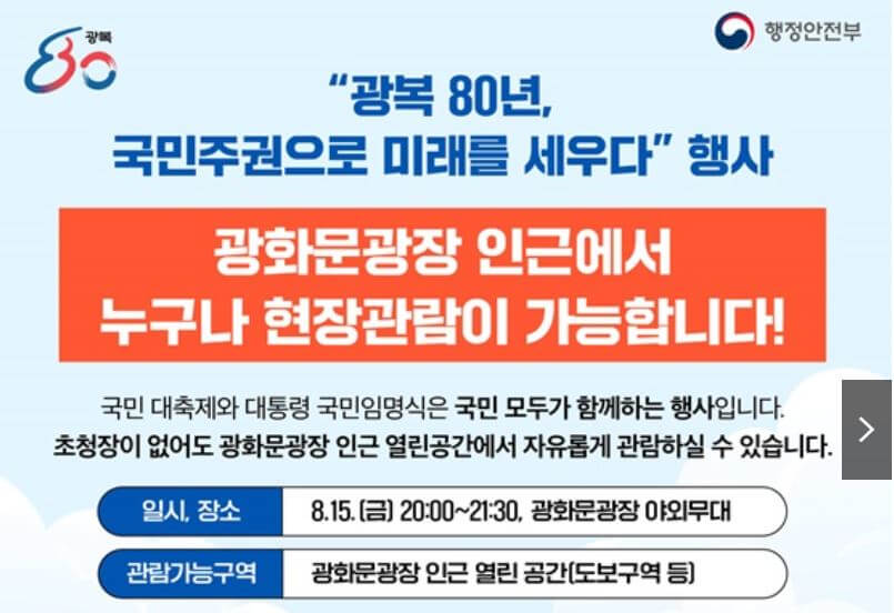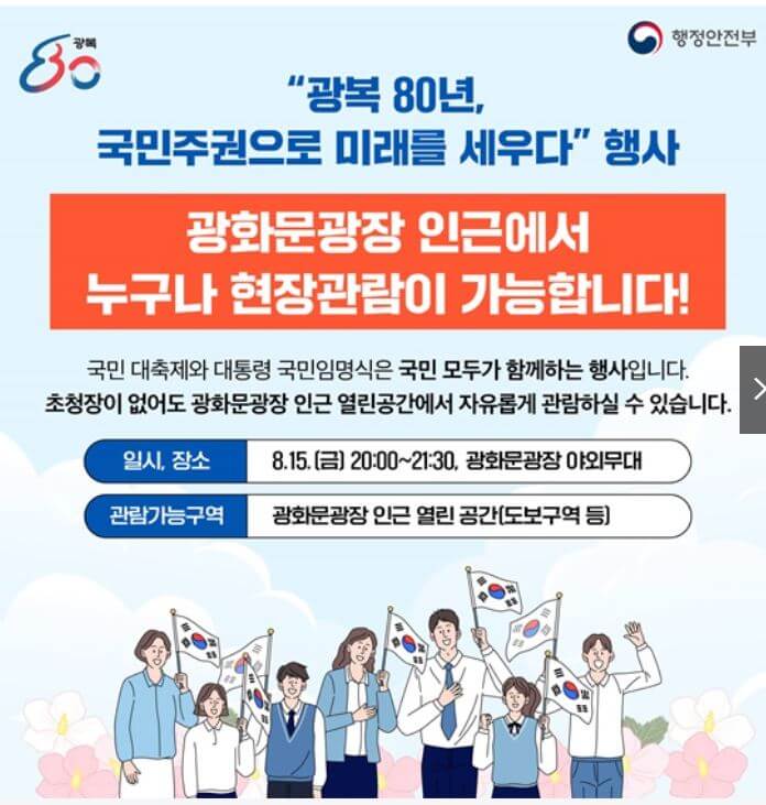 제80주년 광복절(8월 15일) 저녁, 서울 광화문광장에서 제21대 대통령 국민임명식이 열립니다. 본 글은 일정·장소·참여 방법·보안/교통부터 행사 의미·시청 팁까지 한 번에 정리하였습니다.