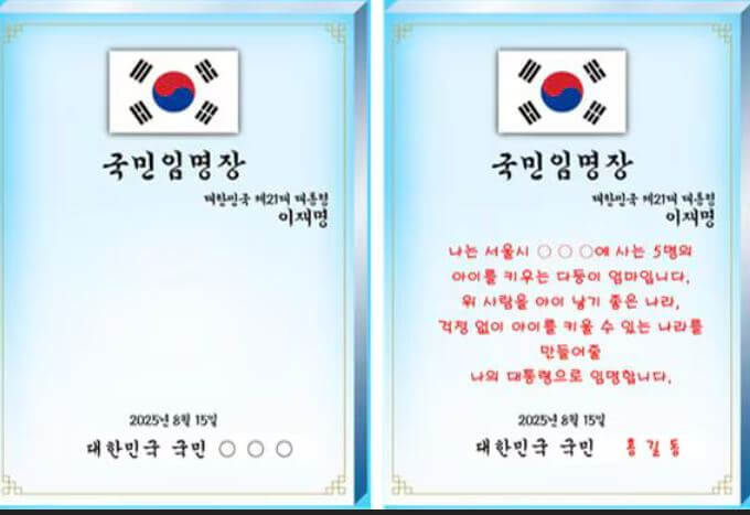 국민임명식은 “국가의 주인은 국민”이라는 원칙을 전면에 세운 상징적 의식입니다. 전통적 취임식과 달리, 국민이 대통령을 임명한다는 메시지를 담고 있으며, 광복 80년의 역사—동학·만민공동회에서 민주화 운동과 촛불에 이르는 국민주권의 흐름—을 조명합니다.