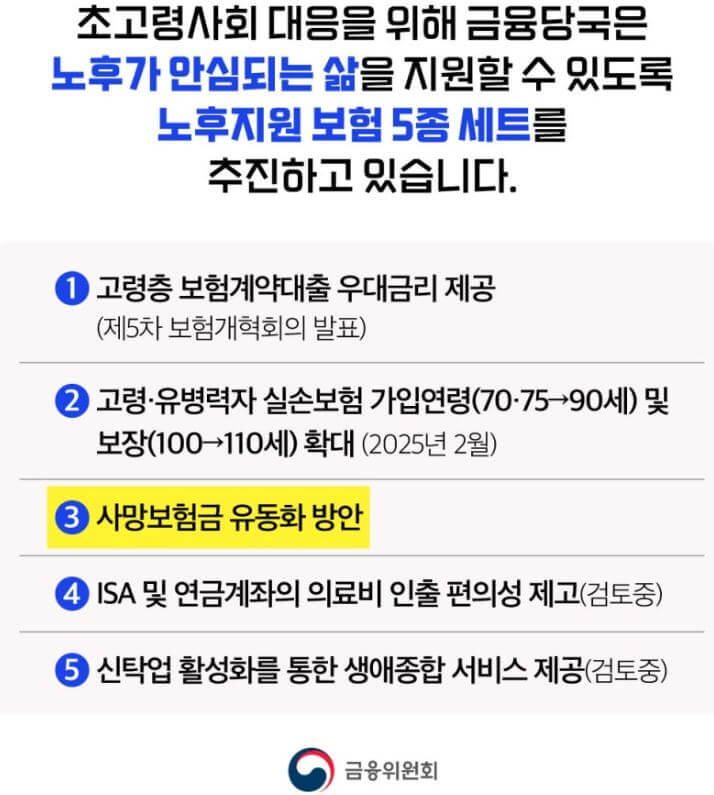 - 2025년 10월부터 5개 생명보험사 우선 출시 → 연말까지 전 보험사 확대