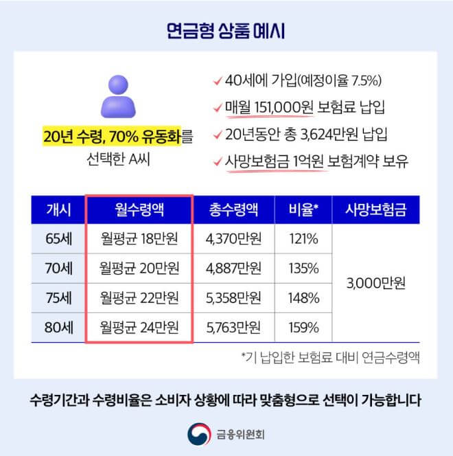 예시) 사망보험금 1억 원, 70% 유동화 선택 시 → 월평균 약 18만 원 수령(20년) + 잔여 3천만 원은 유족에게 지급